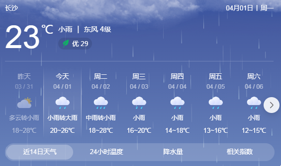 为你提供快速准确的长沙一周天气预报,未来5天的天气预报和气象趋势预测,主要指标包括每天最高气温最低气温天气状况风向等。
