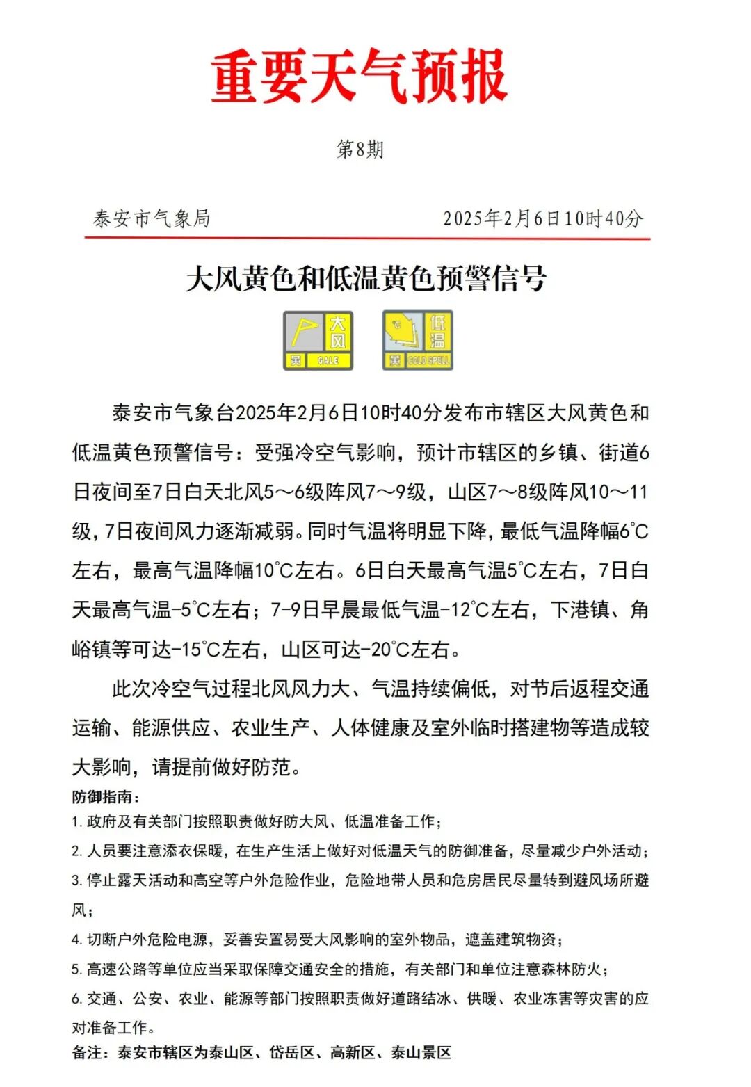 8、预计今天下午到明天上午,泰安市将迎来雷阵雨天气,并伴有79级雷雨大风泰安市气象台已发布雷电黄色预警信号,请市民注意防范 受影响区域与时间。