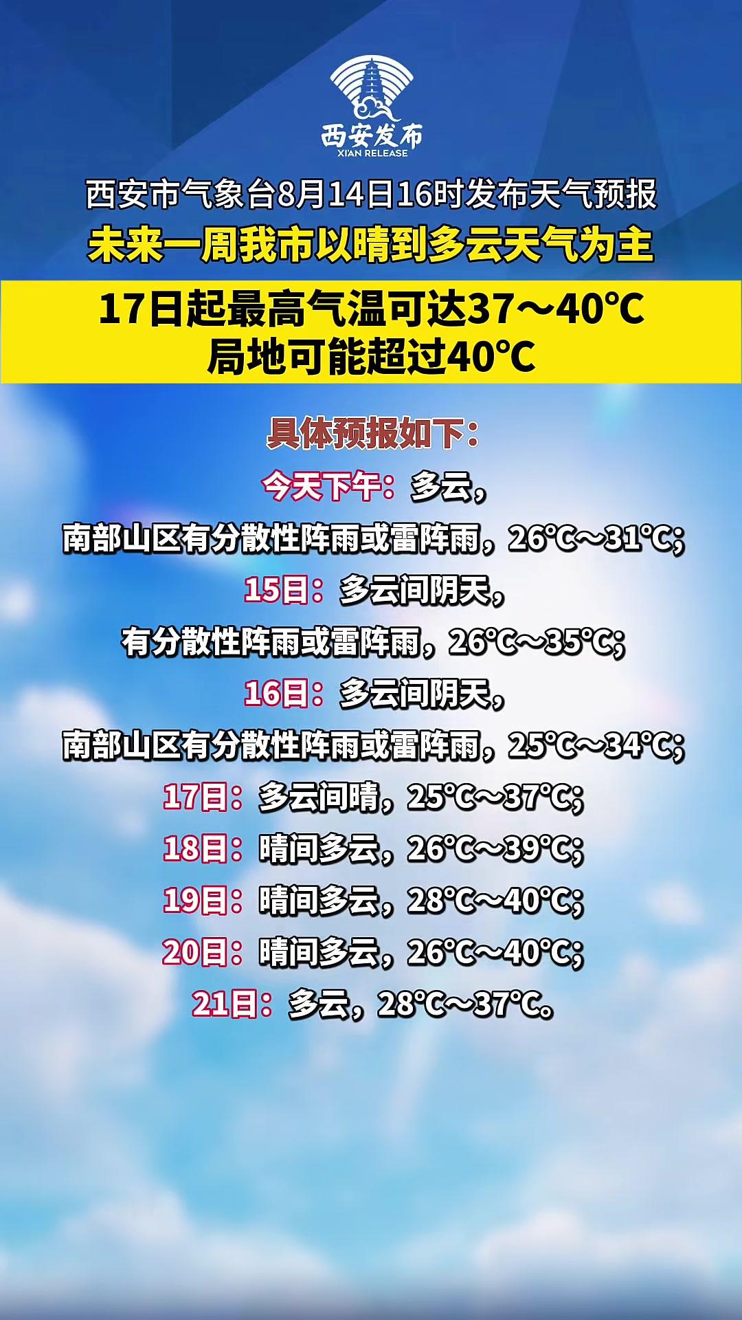 1 西安当前气温及穿着建议目前西安的气温大约在几度到十几度之间,偶尔会超过20度室内较为温暖,不需要额外供暖建议穿着单裤牛仔或休闲款式,以及轻便的鞋子上衣可以是一件T恤,外搭一件简约的外套,无需毛衣2 西安近期天气与穿着建议西安最近最高温度大约10度,最低温度1度左右;西安的天气在接下来的24小时内将经历多变,从1700的多云开始,气温保持在12度至17度之间到了1700,天空将转为小雨,气温维持在15度左右预计到2000,雨势将稍有减弱,气温降至14度夜幕降临,2300的小雨让气温进一步下降至13度凌晨时分,200的小雨依旧持续,气温降至最低,仅12度500随;1 西安本周天气预报8月10日16日今日8月10日,西安以阴天为主,最高气温达33摄氏度,最低气温为25摄氏度明日8月11日,天气阴转多云,最高气温33摄氏度,最低气温25摄氏度2 天气展望8月12日,西安多云,最高气温34摄氏度,最低气温27摄氏度3 周末天气周六8月13日。